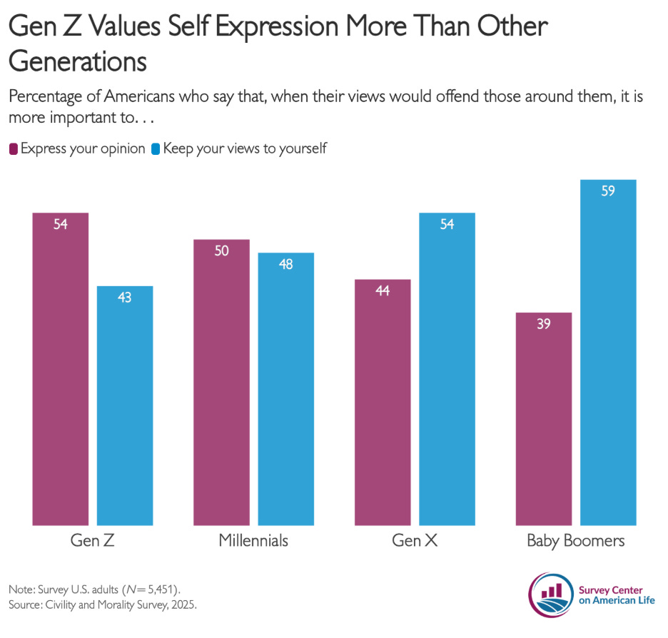 A survey we conducted this year found that 54 percent of Gen Z adults said it was more important to say what they think on a given topic even if it made people uncomfortable. Only thirty-nine percent of Baby Boomers agreed, while nearly six in ten (59 percent) among them said it was better to keep their views to themselves. I am not suggesting that people should stay silent on issues that are important to them, but rather that the right to speak does not require the constant exercise of it.