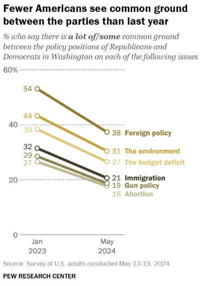 Too often, the goal is to prove that your opponent’s views are based on faulty logic, a morally compromised worldview, or simply ignorance. We’ve become inured to this type of political engagement because compromise and conciliation seem either out of reach or undesirable. Polls have found that Americans are losing faith in our ability to find common ground with our political opponents. Pew found that, in just over a year, the percentage of Americans who said Democrats and Republicans can find common ground on key policy issues has plummeted. On issues like abortion, gun control, immigration, and foreign policy, fewer Americans believe that it’s possible to find consensus. Yet the public still wants its elected leaders to seek compromise.