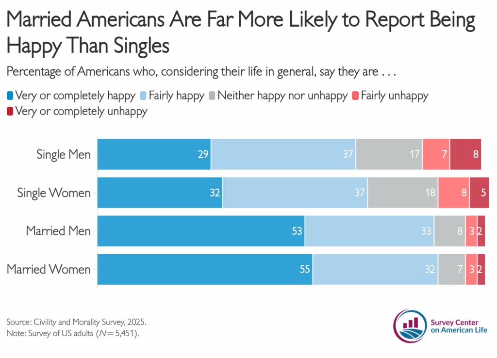 Even if personal happiness is the goal, remaining single is hardly any guarantee of well-being. In fact, research shows that compared to singles, married people report higher rates of personal satisfaction and happiness (at least as best we can measure these things on surveys). This is a pattern that holds regardless of age, race and ethnicity, educational status, and religious affiliation. A 2025 survey found that married people are leading happier lives on average than those who are single. And it’s not particularly close; 86 percent of married men and 87 percent of married women are happy with their lives compared to 66 percent of single men and 69 percent of single women.