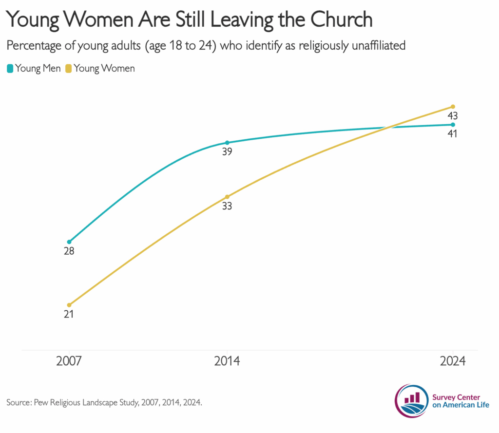 Two years later, more research provides further corroboration. While secular identity has plateaued among young men, it continues to rise among young women. From 2014 to 2024, young women became far less religious: 43 percent identify as religiously unaffiliated today compared to 33 percent a decade earlier. Young men showed almost no change over the same time period.