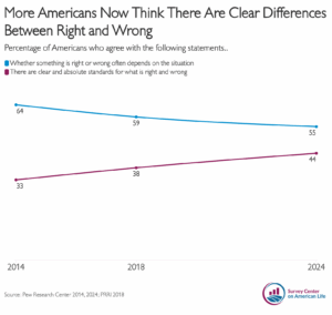 More Americans have come to believe that there are clear and absolute standards for what is right and wrong. Just over a decade ago, only one third of Americans agreed that such clear standards existed. In 2024, that percentage increased to 44 percent. Americans who embraced a notion that morality—what is right and wrong—is situational dropped from 64 percent to 55 percent. There are stark political differences in